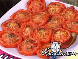 Colocar los tomates en una bandeja de horno, sazonarlos y espolvorear con la cebolla y parte del perejil picados.